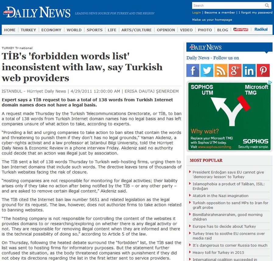 Auf dieser Basis gab es bereits seit einigen Jahren ein Gesetz, das es der Regierung erlaubt hat, verschiedene Webseiten durch die türkischen Internetprovider sperren zu lassen. 2011 wurde eine Liste mit 138 „schädlichen“ Wörtern wie „gay“, „free“, „adult“ und türkischen Übersetzungen von „nackt“, „heiß“ oder „Schwiegermutter“ veröffentlicht, die aus Gründen des „Verbraucherschutzes“ in Domainadressen verboten wurden. Nach Einführung dieser Sperrliste gingen prompt mehrere Webseiten von Kondomherstellern und Unterwäschefirmen vom Netz.