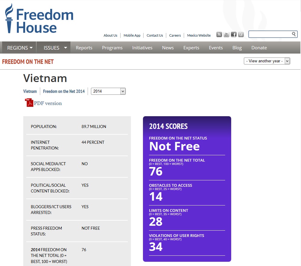 Die „Reporter ohne Grenzen“ haben Vietnam als einen „Internet-Feind“ eingestuft. Die vietnamesische Regierung hingegen behauptet, das Volk vor sexuellem oder anderweitig obszönem Content schützen zu wollen. Viele der ausgesperrten Seiten enthalten jedoch politische oder religiöse Inhalte, die die Macht der kommunistischen Partei schmälern könnten. Nach Berichten von Amnesty International haben Internet Aktivisten Arreste für ihre Online-Aktivititäten in Kauf nehmen müssen.